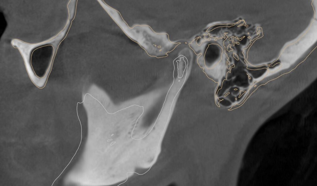 Prin suprapunerea structurilor osoase, a dinților și a modelului mandibular (MODJAW), putem vizualiza traseul și poziția condilului în fosa articulară. Pe baza acestei analize, stabilim poziția terapeutică a mandibulei, care devine reperul pentru realizarea designului gutierei.